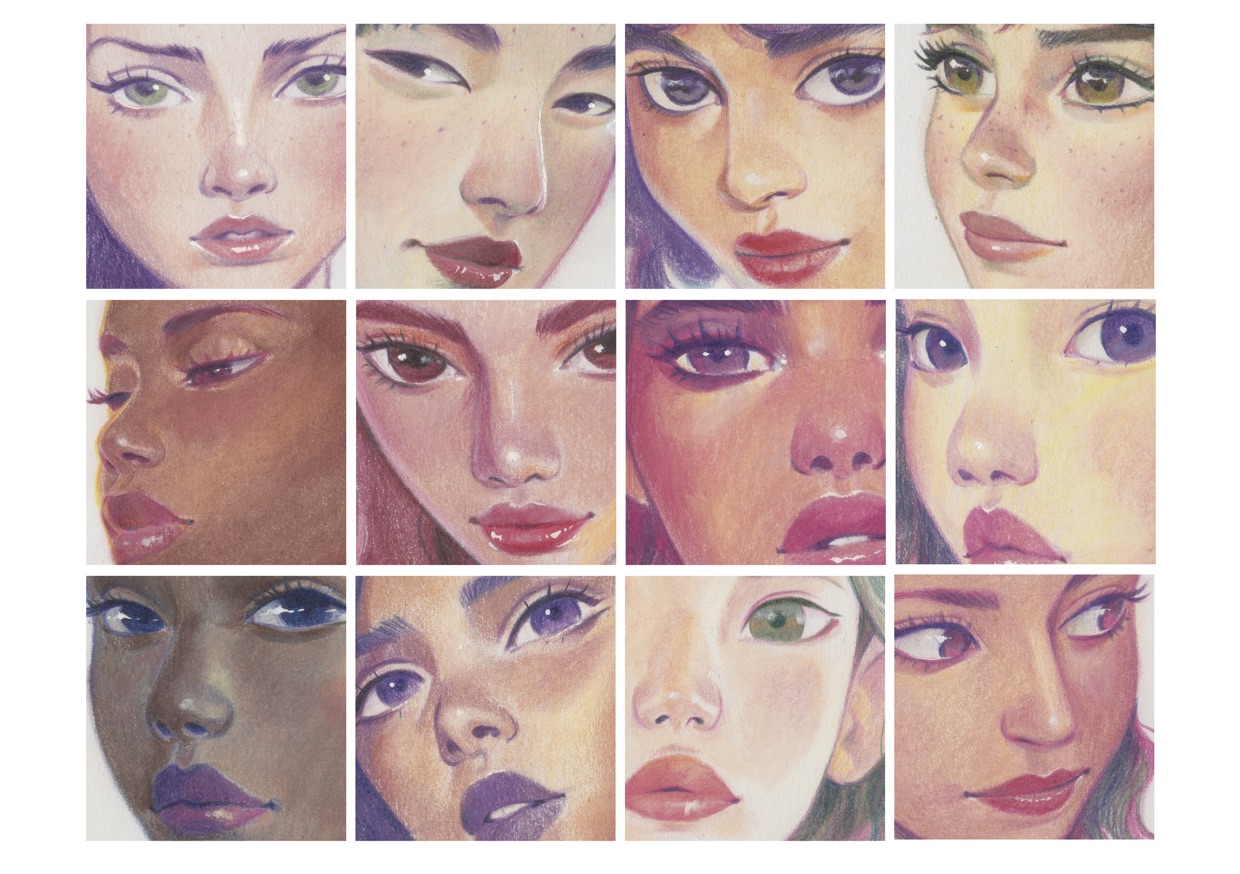 Retrats de 13 persones fets amb llapis de color i pastels a l’oli sennelier.