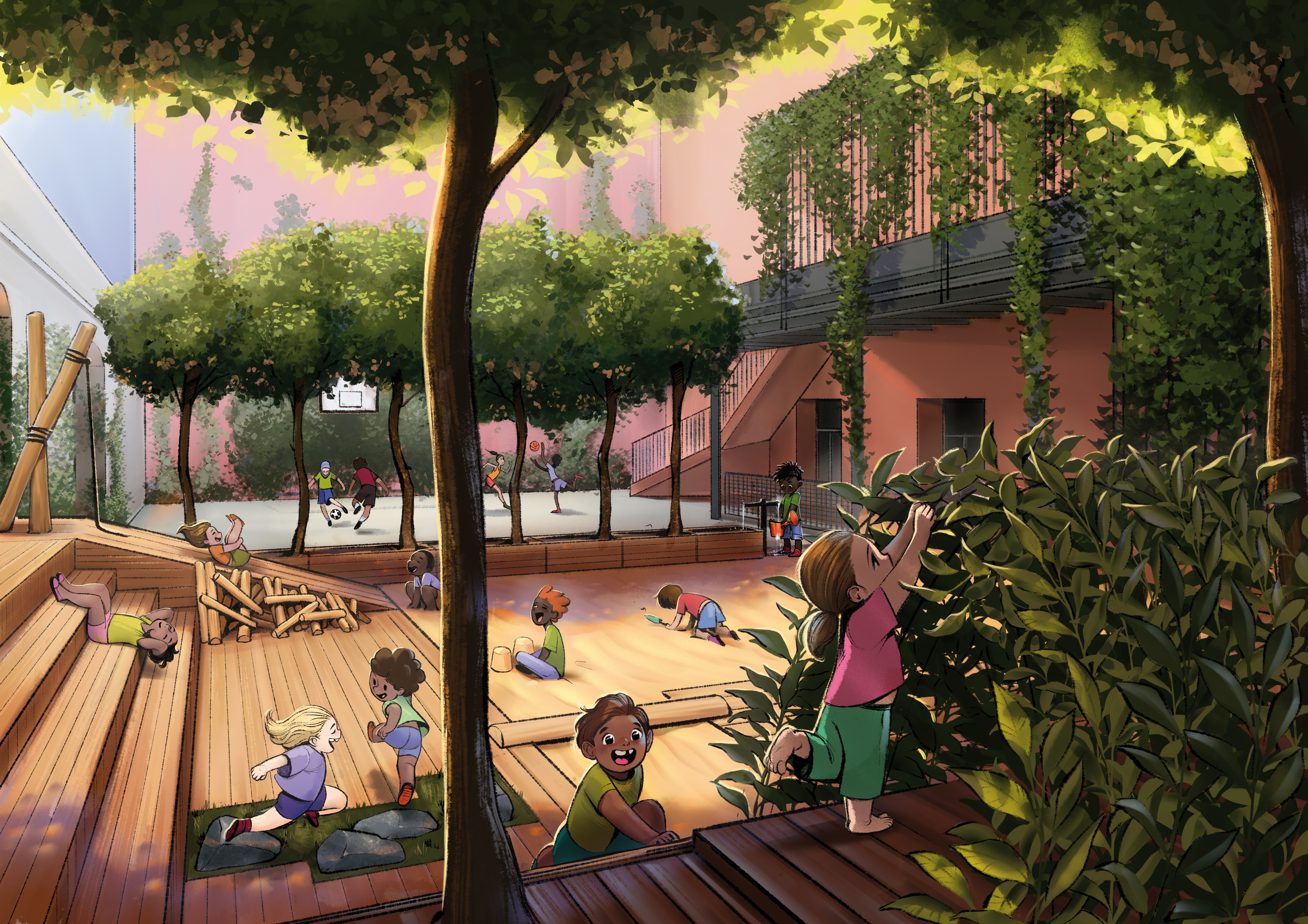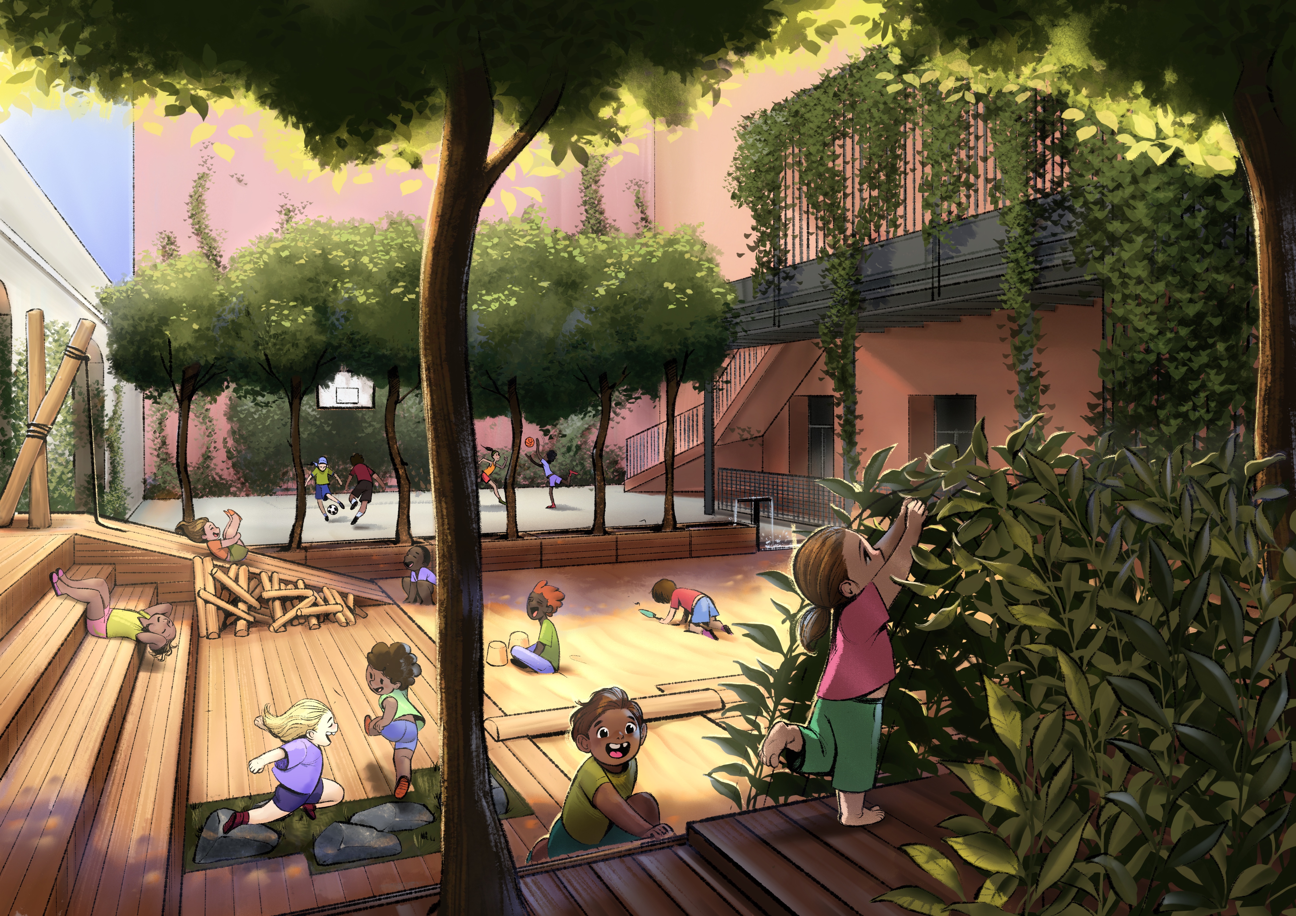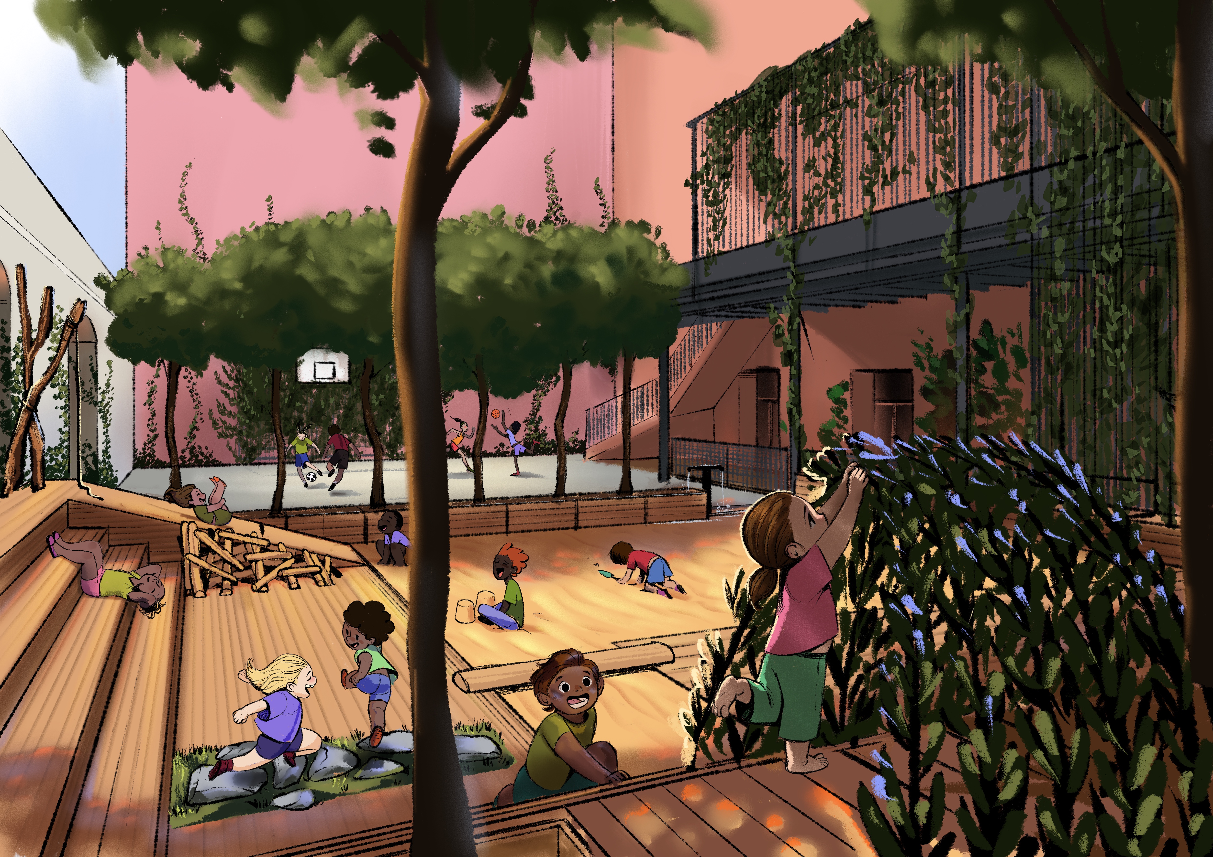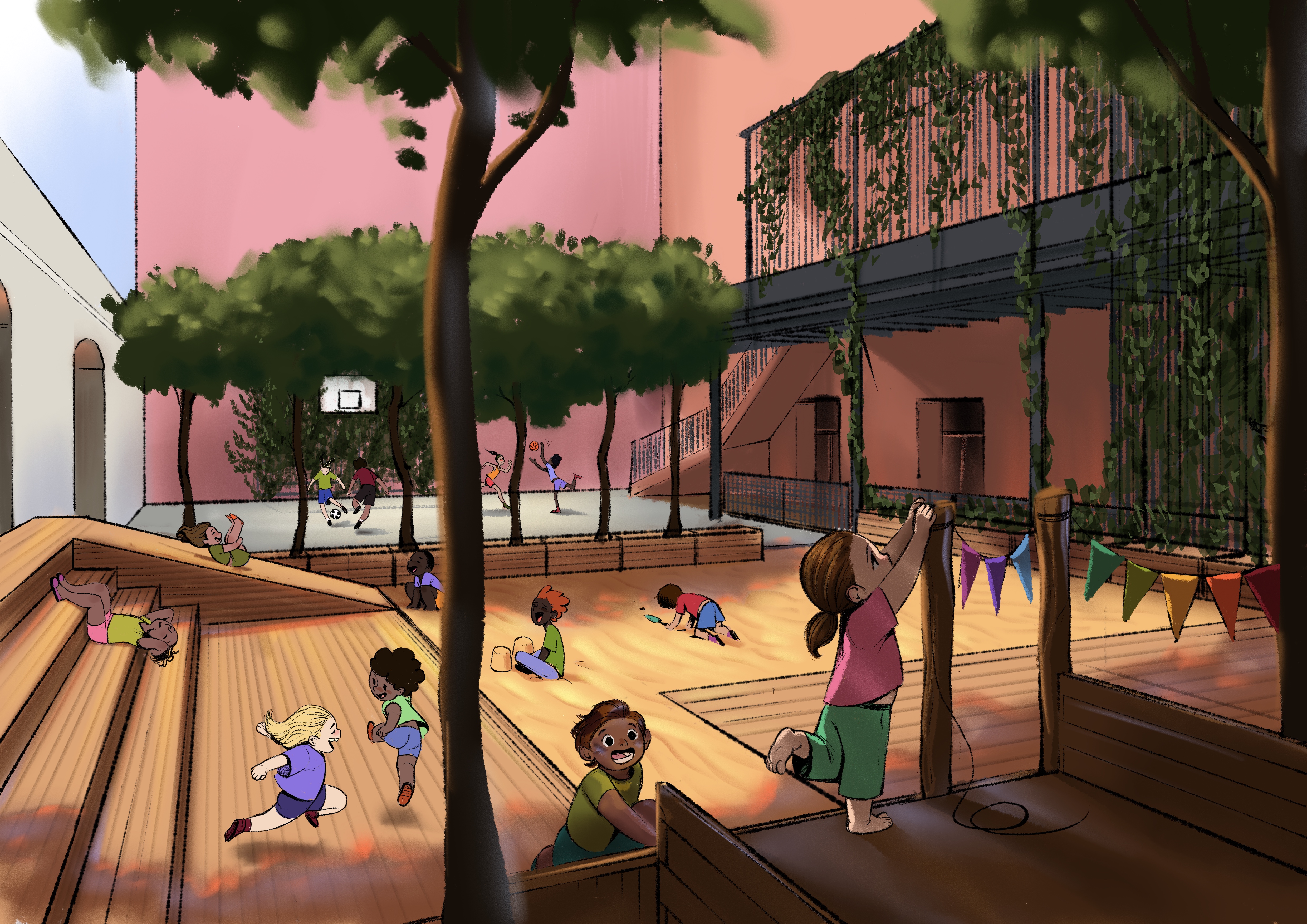 Dues peces que il·lustren les propostes dels alumnes de l'escola Cervantes i La Maquinista de Barcelona per millorar el pati de les seves escoles.