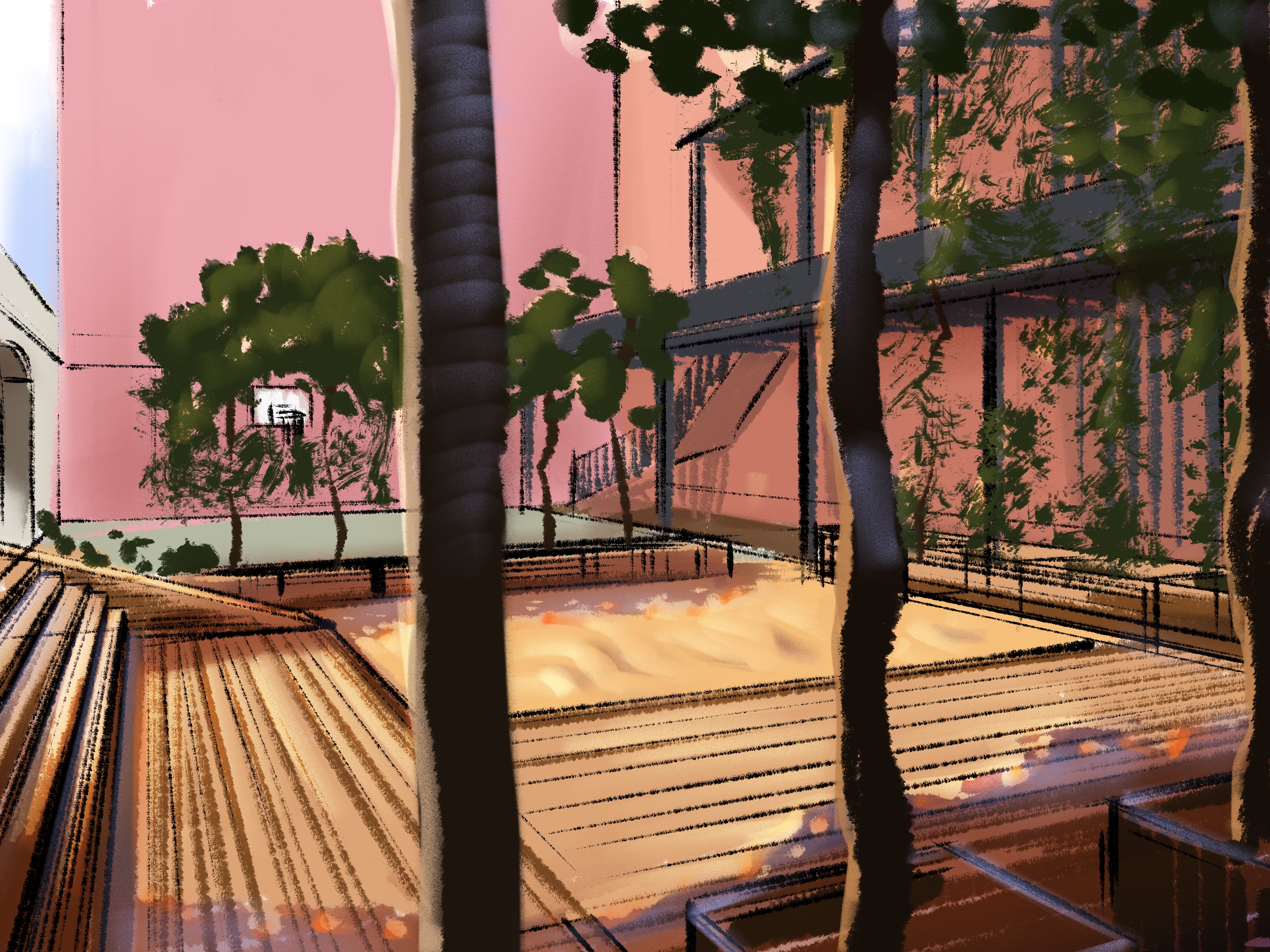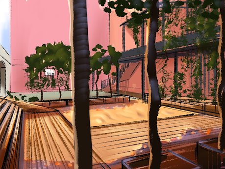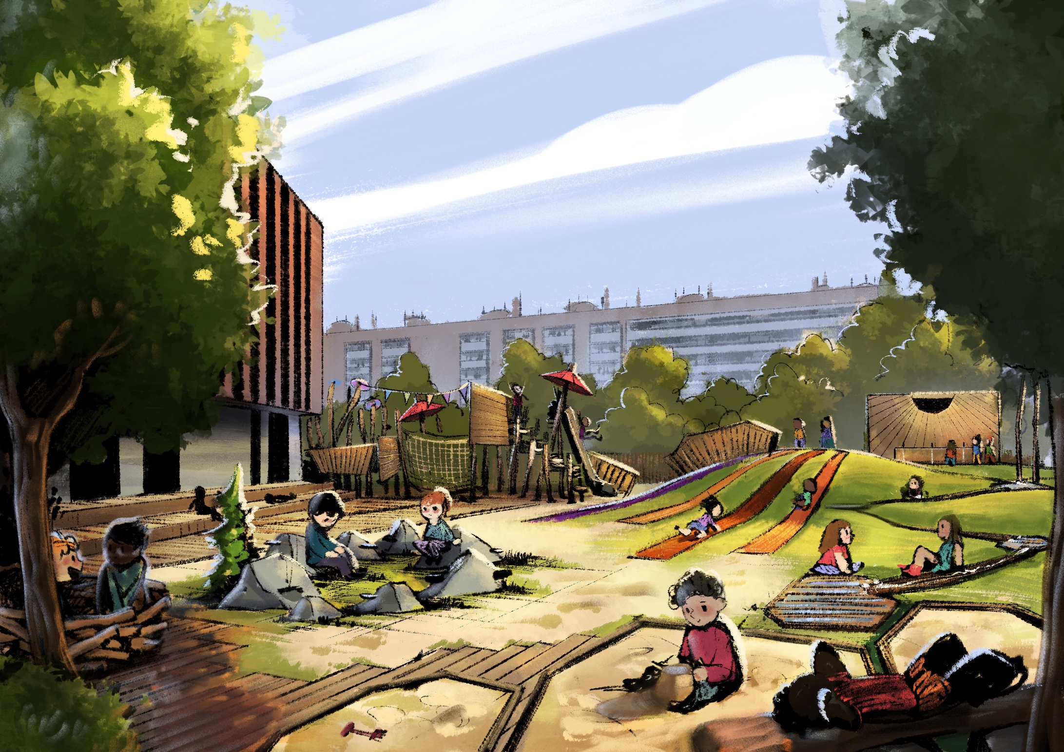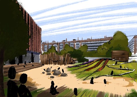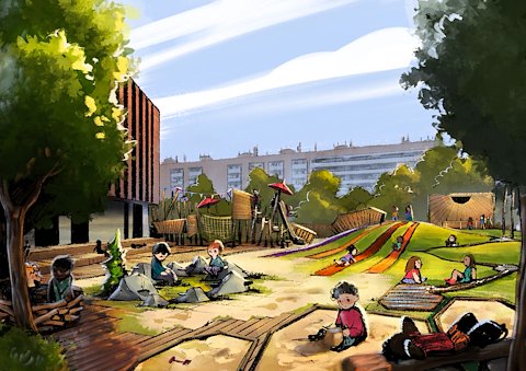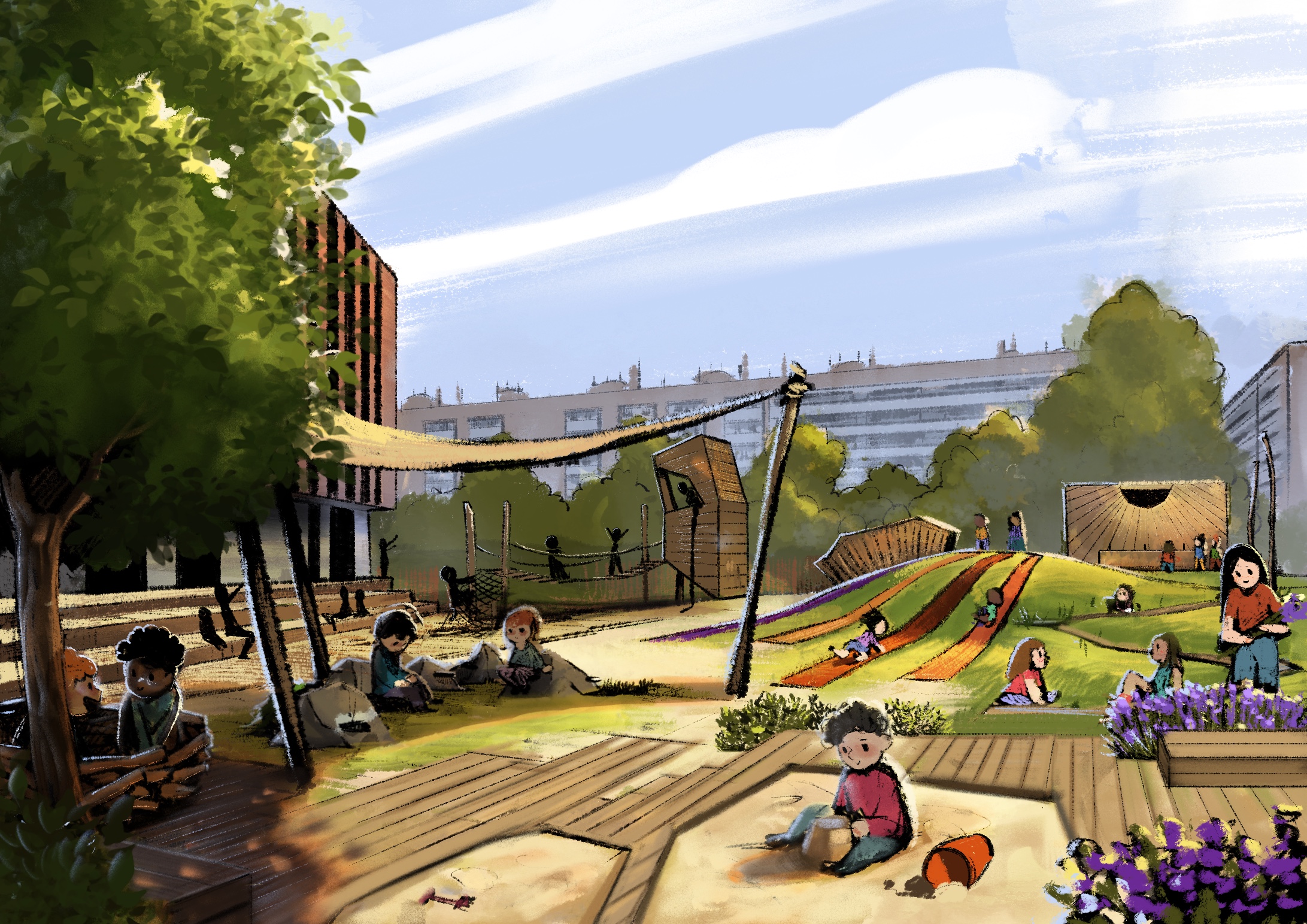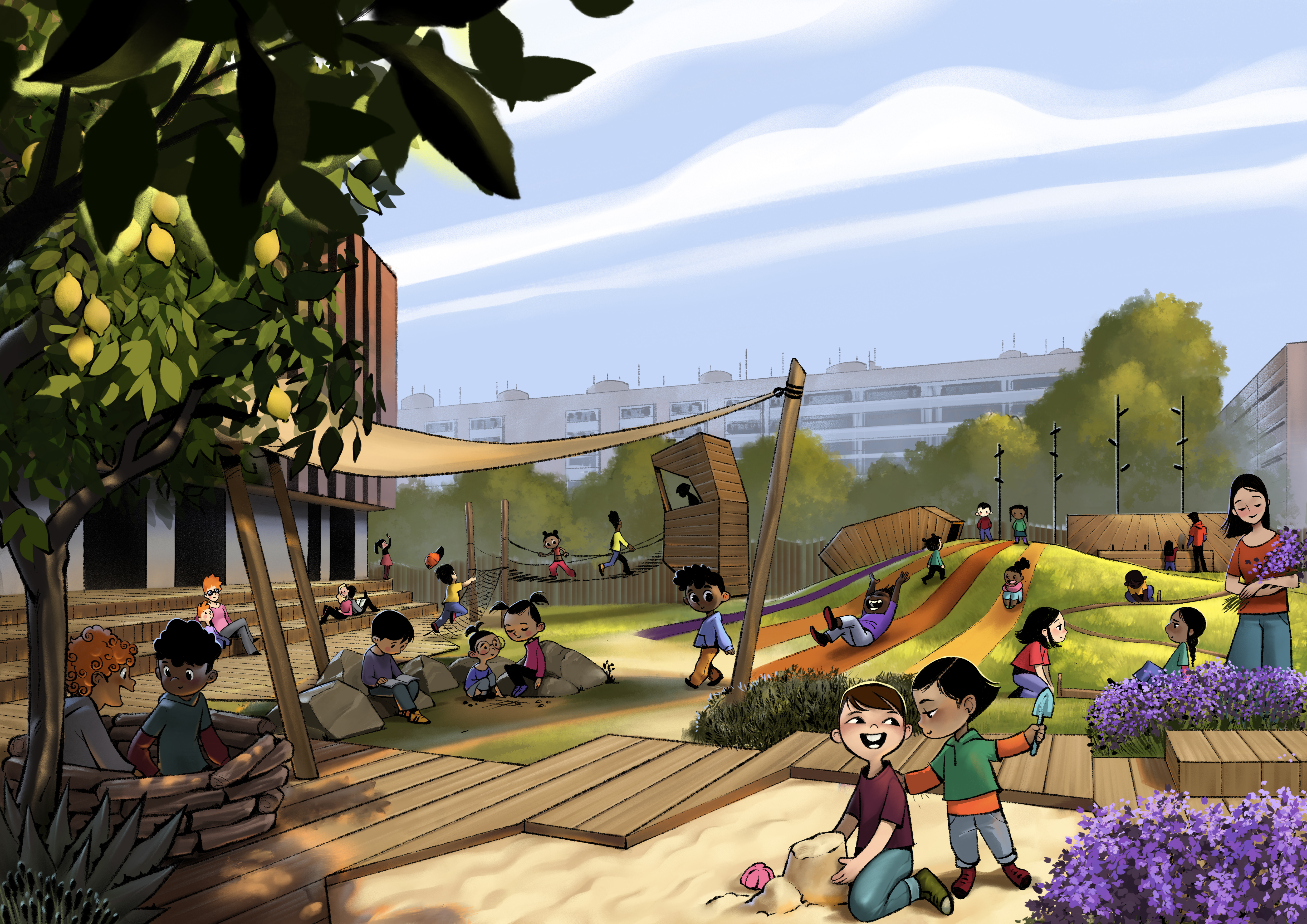 Dues peces que il·lustren les propostes dels alumnes de l'escola Cervantes i La Maquinista de Barcelona per millorar el pati de les seves escoles.